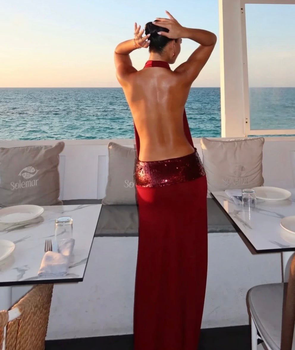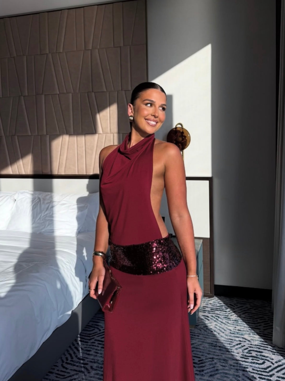 The Adele Gown in Wine. A halter gown with a draped cowl neck, open back, and a low-sitting sequinned waistband that hugs the hips. The fluted skirt falls asymmetrically, flowing effortlessly as you walk.