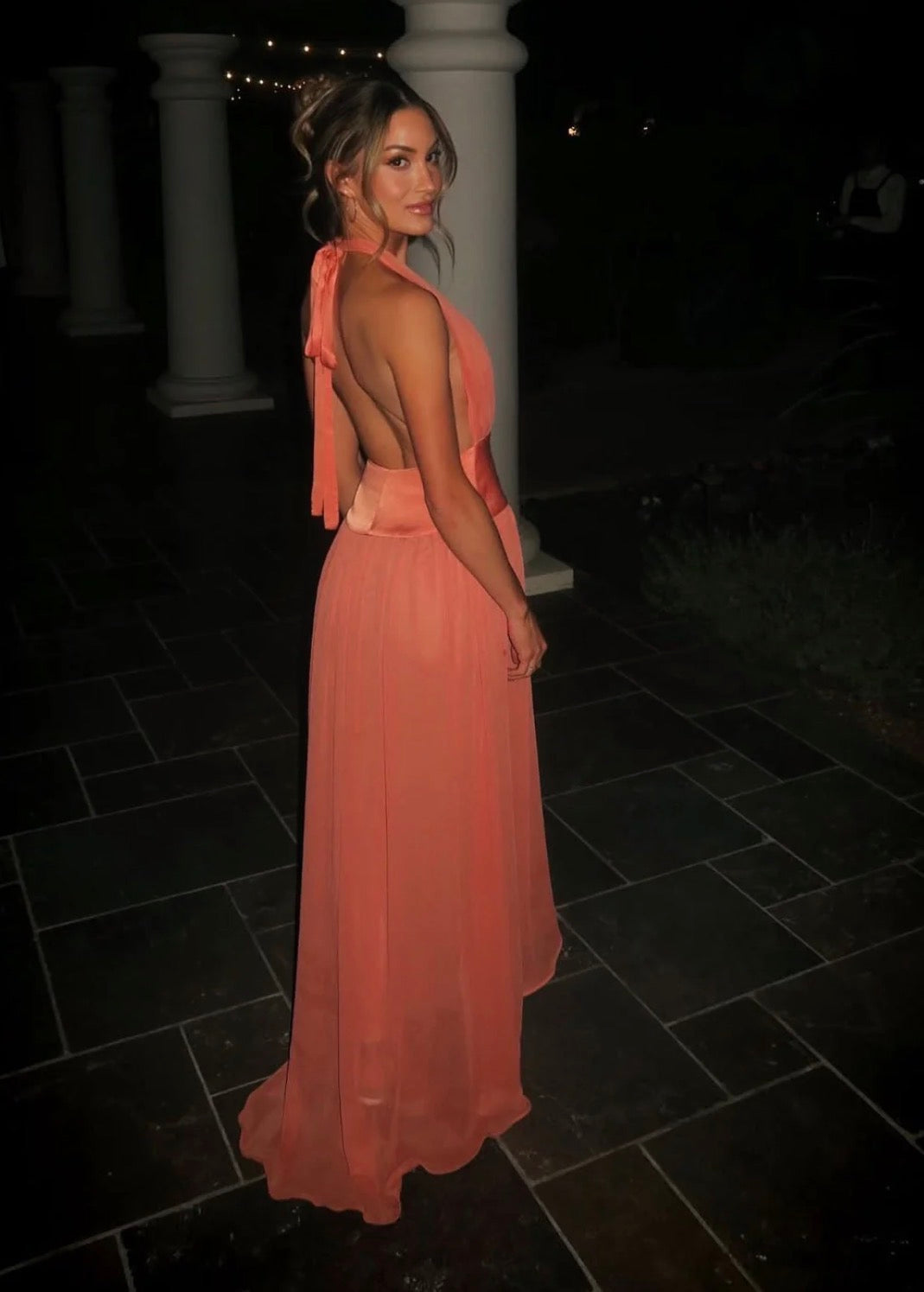 Introducing Serena, a striking fusion of femininity and elegance. Designed in a lustrous Coral hue, she radiates a warm and earthy charm. Serena features a flattering drop-waistband crafted from a quality viscose. Her graceful georgette drape cascades over the bust and flows from the hips. Fasten her sensual halter neckline securely around your neck, and let the ties gracefully trail down the open back. Lined to complete, Serena is the perfect selection for your sunlit seasonal sips.