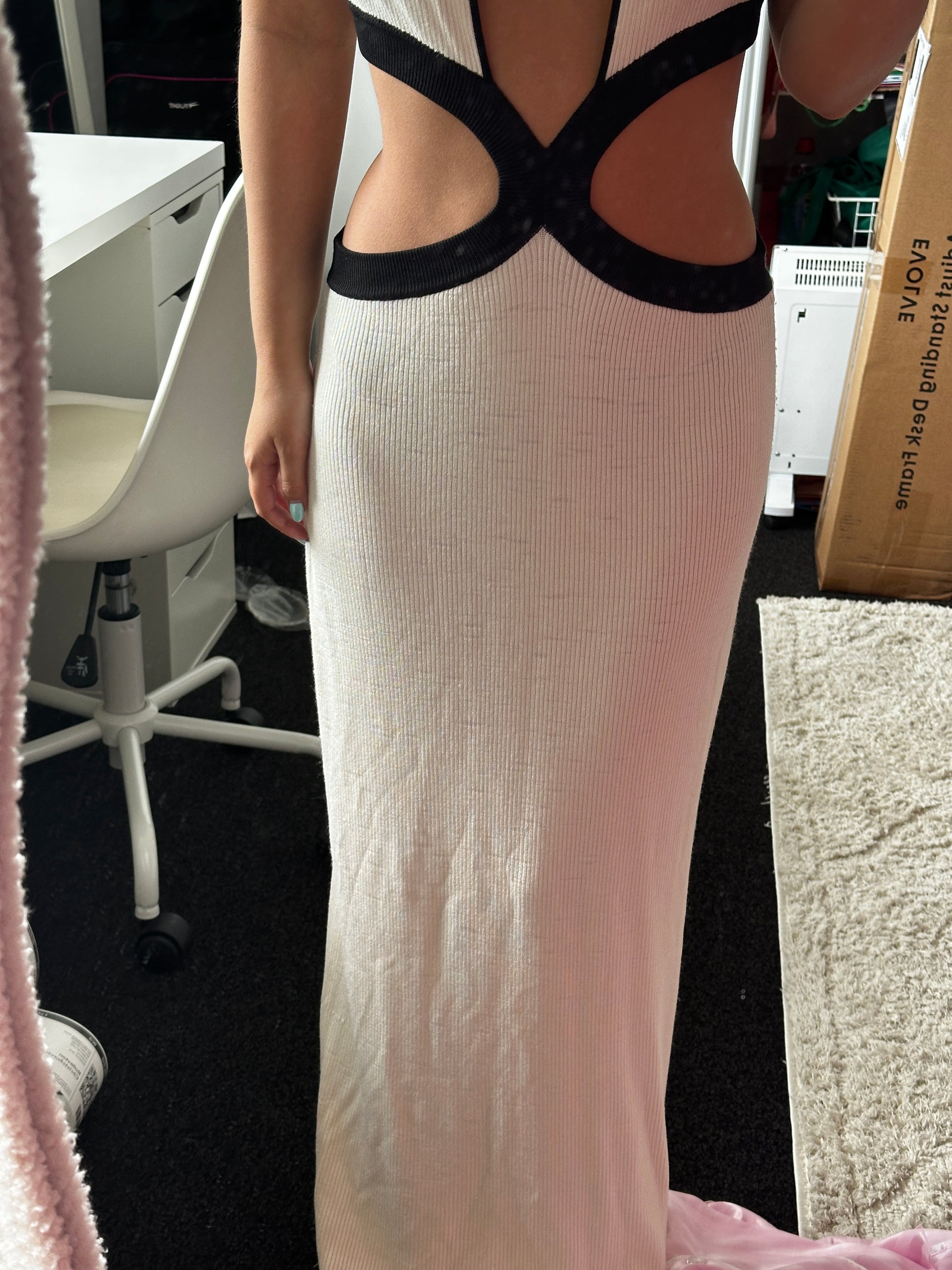 Knitted dress with rib. Circle-shaped cut-outs. Halter neck. Rib collar buttons at back. The front and back bodice split to the collar. Full length. Split in the hem.
