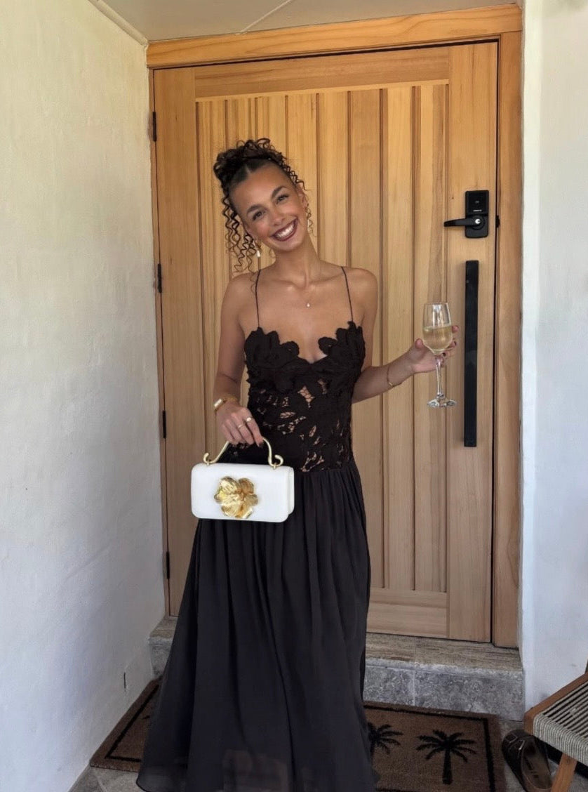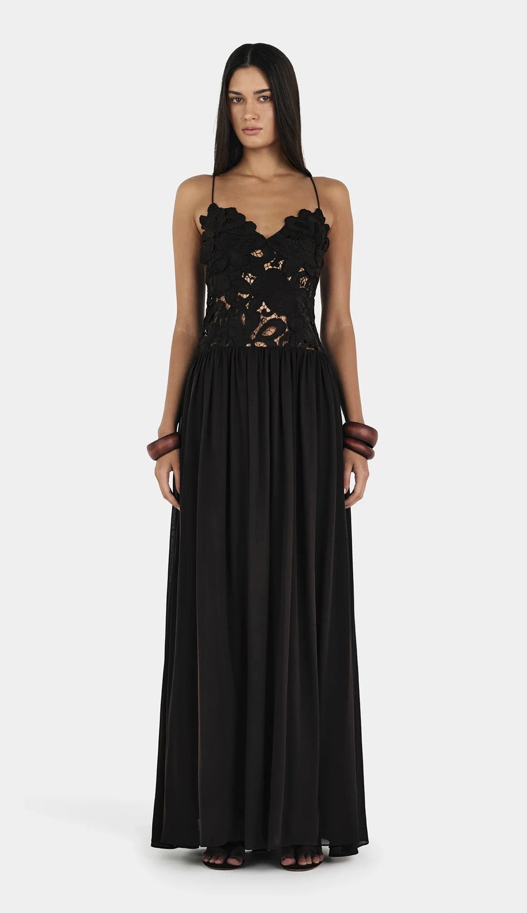 The Stephanie Maxi Dress in black is a maxi length dress with a sheer lace waist detailing and lined bust cups that falls into a gathered, full skirt. The dress has roleau straps with length extension for the perfect fit. The Stephanie is the perfect piece for your next special event. The Stephanie Dress is hand-stitched and crafted from a delicate fabric. Please handle with care.